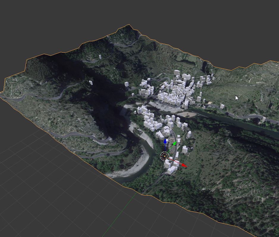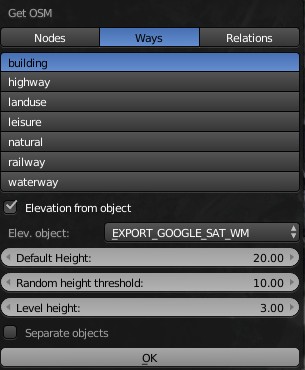 Select Ways, Buildings and choose a default height value for extruding buildings that don't have any height information. This default height value can also be randomized between a threshold to add some realism. Check the option Elevation from object and select the mesh representing the ground relief, then press ok. After few seconds you will see the imported buildings.