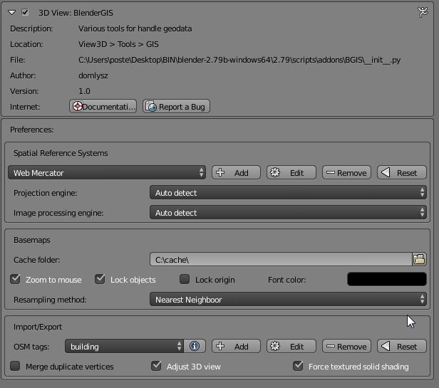 - Install BlenderGIS addon and set the cache folder in preferences settings