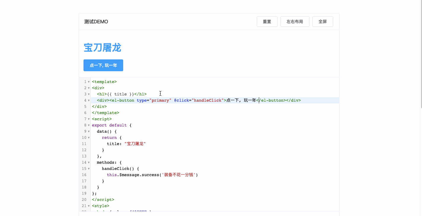 <div><el-button type="primary" @click="handleClick">点一下, 玩一年</el-button></div>