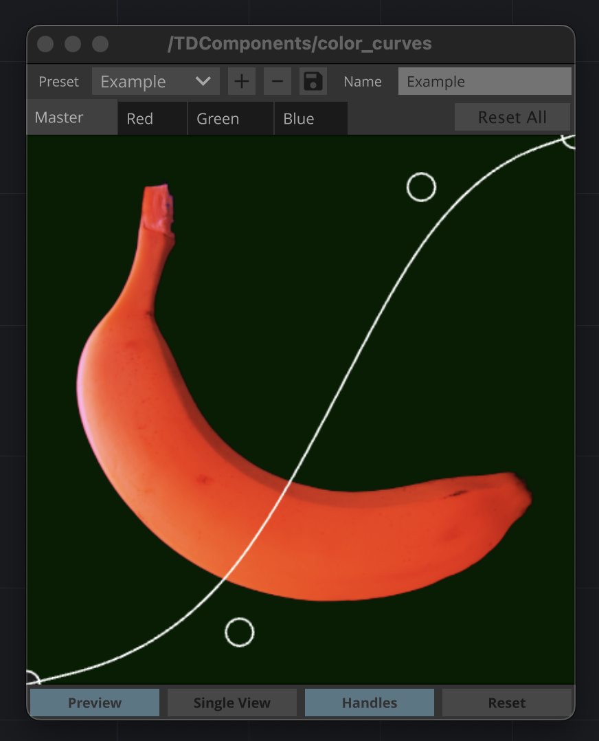 ColorCurves graphically adjusts per-channel color levels of a TOP using a plotted curve, similar to many image and video editing applications. Credit goes to Vasily for authoring the original version of this component, to which I built onto.
