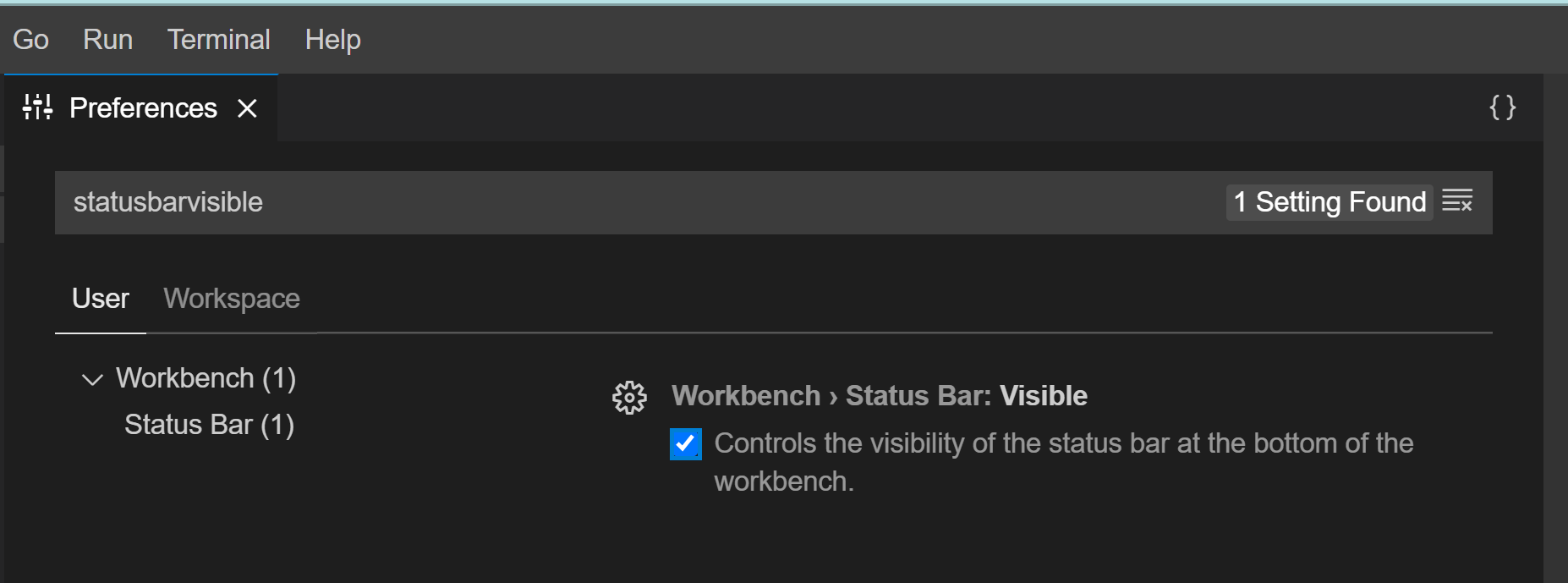 workbench.statusBar.visiblesetting in the preferences file.How to test