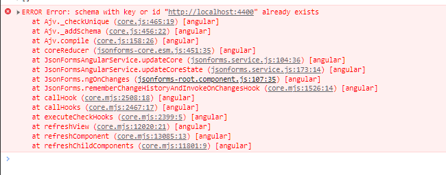 It seems like the schema passed to the ajv instance is not cleared when a new update/schema is passed to the jsonForms with updated values.