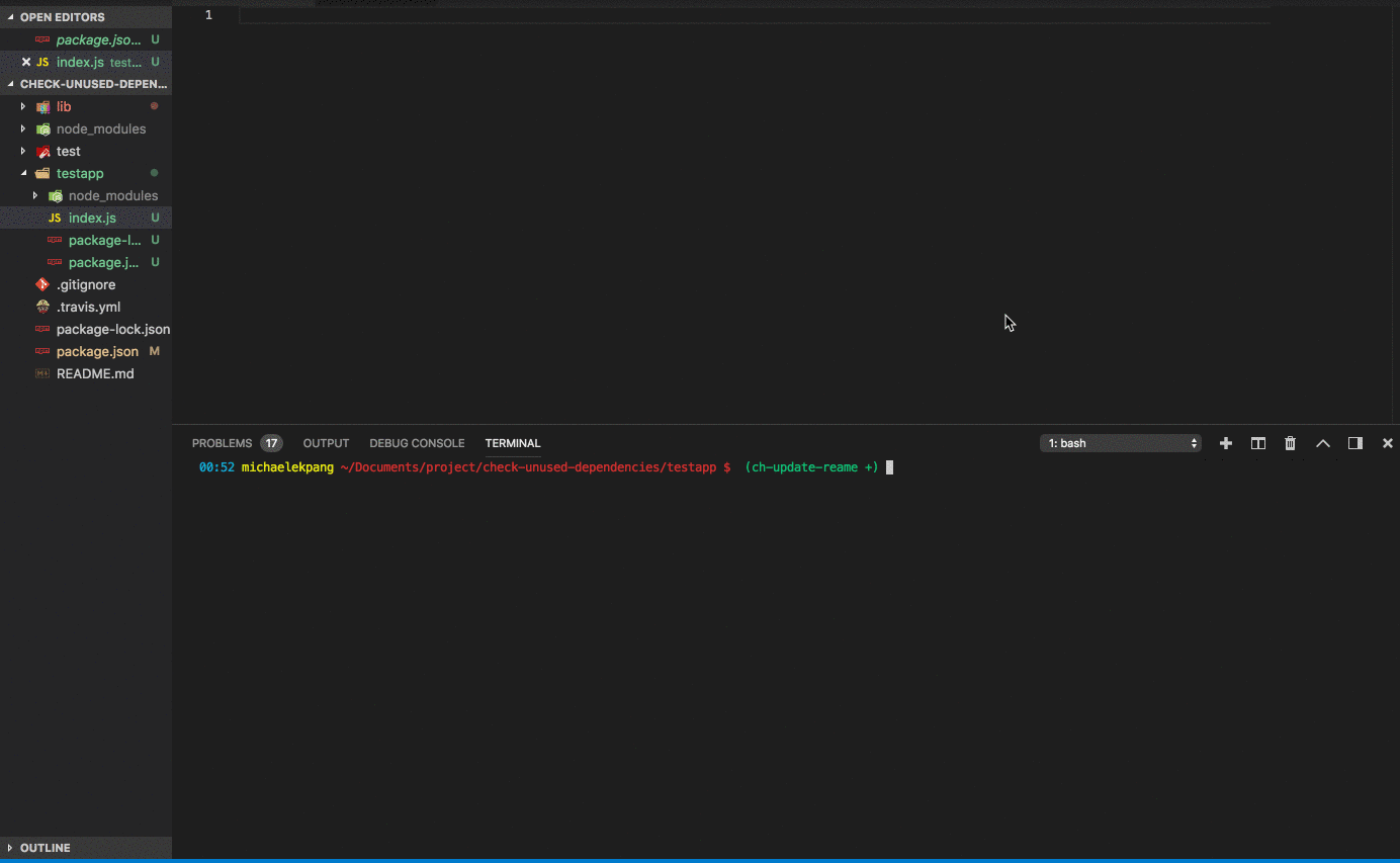 $ sudo npm install -g check-unused-dependencies$ npm install check-unused-dependenciescd into any project and run check-dep