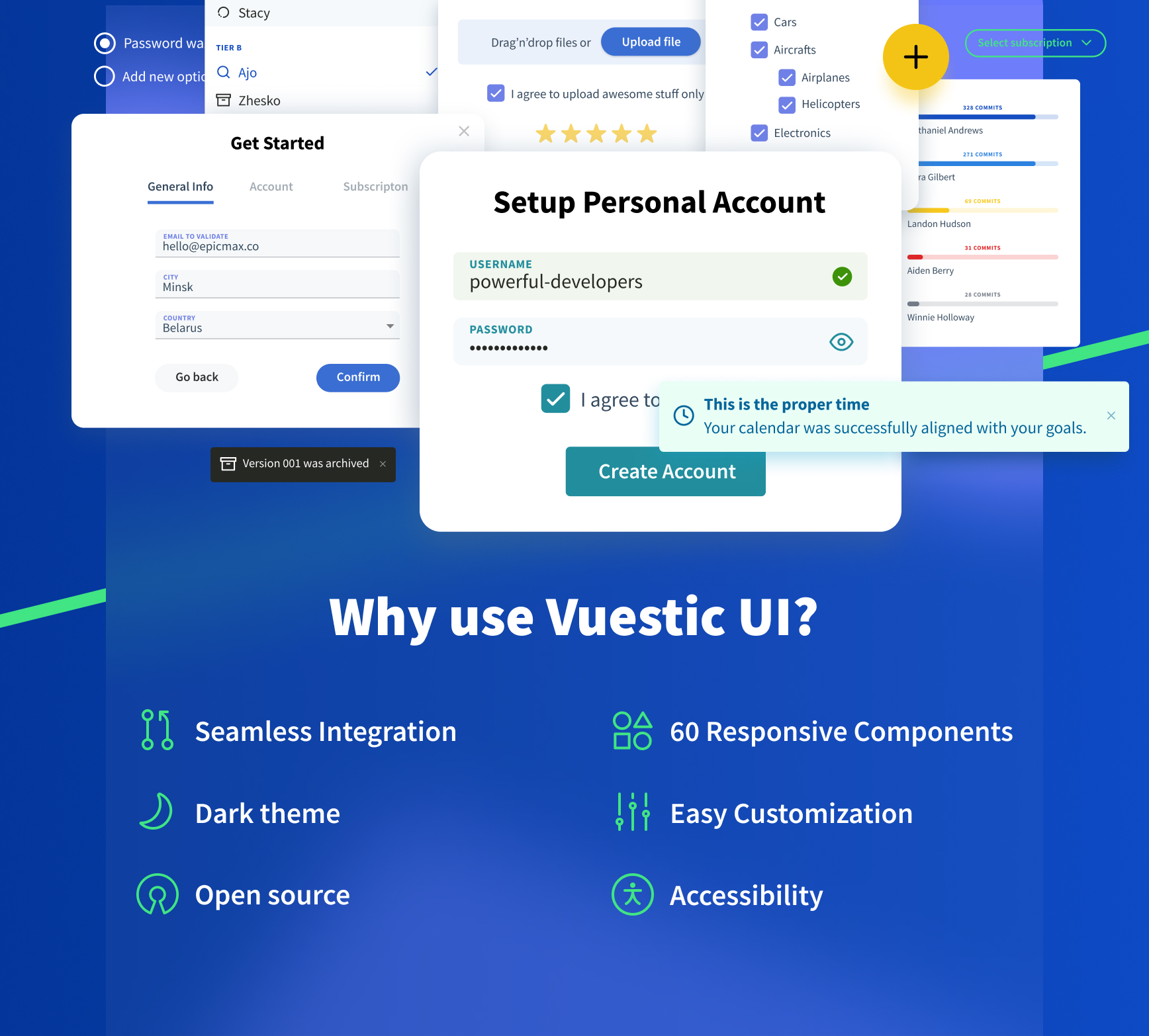 npm create vuestic@latestDocumentation, guides, examples and tutorials are available on ui.vuestic.dev