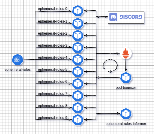 ephemeral-roles:- Runs in a Kubernetes cluster as a StatefulSet of 10 Pods. Each Pod contains a running instance of the bot