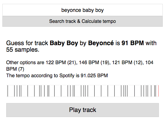 This project uses the browser's Audio API to guess the tempo of a song, processing a chunk of 30 seconds of music. For more information, read the blog post Beat Detection Using JavaScript and the Web Audio API, from where I've taken the code to perform the track analysis. I have also written a post explaining the project more in depth.