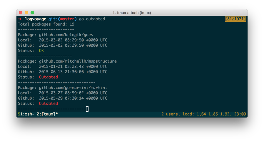 go get -u github.com/firstrow/go-outdatedNote: To use this library without limitations, you should create GitHub access token.