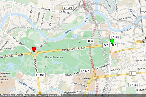 $ create-static-map --width 600 --height 400 -o map2.png -z 14 -m "52.514536,13.350151"A map with two markers (red and green). If there are more than two markers in the map, a good zoom level can be determined automatically: