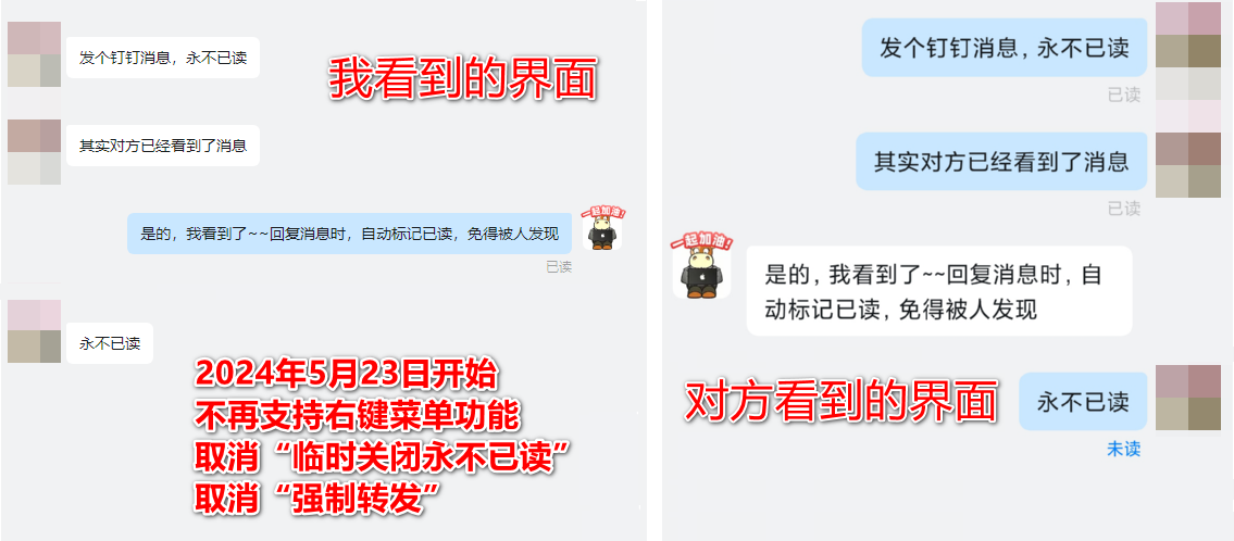🆕支持消息永不已读(仅支持钉钉7.0.0及以上版本,2024年5月23日开始,不再支持聊天窗口右键临时关闭永不已读功能,如需临时关闭,请重装安装补丁且不要勾选消息永不已读)
