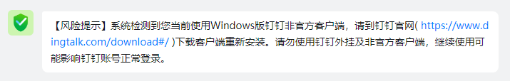 2025-01-01 更新: 吾乐吧软件站提醒大家:自从2024年3月21日开始,大概是从钉钉 7.5.10 版本之后开始,钉钉官方增加了“非官方客户端风险提示”,后面一段时间,小编也升级了补丁,解决了相关问题。但是从钉钉 7.6.0 开始,钉钉再次升级了相关限制,导致“屏蔽非官方客户端风险提示”功能失效 ,如果有大神可以解决此问题,欢迎加入QQ群:390669197 交流!临时解决方案:①降级到钉钉 7.5.10 以前的版本;②无视这个风险提示,顺其自然; ③如果你非常在意这个提示,以及担心后续账号问题,那么只能卸载此补丁,使用官方钉钉;