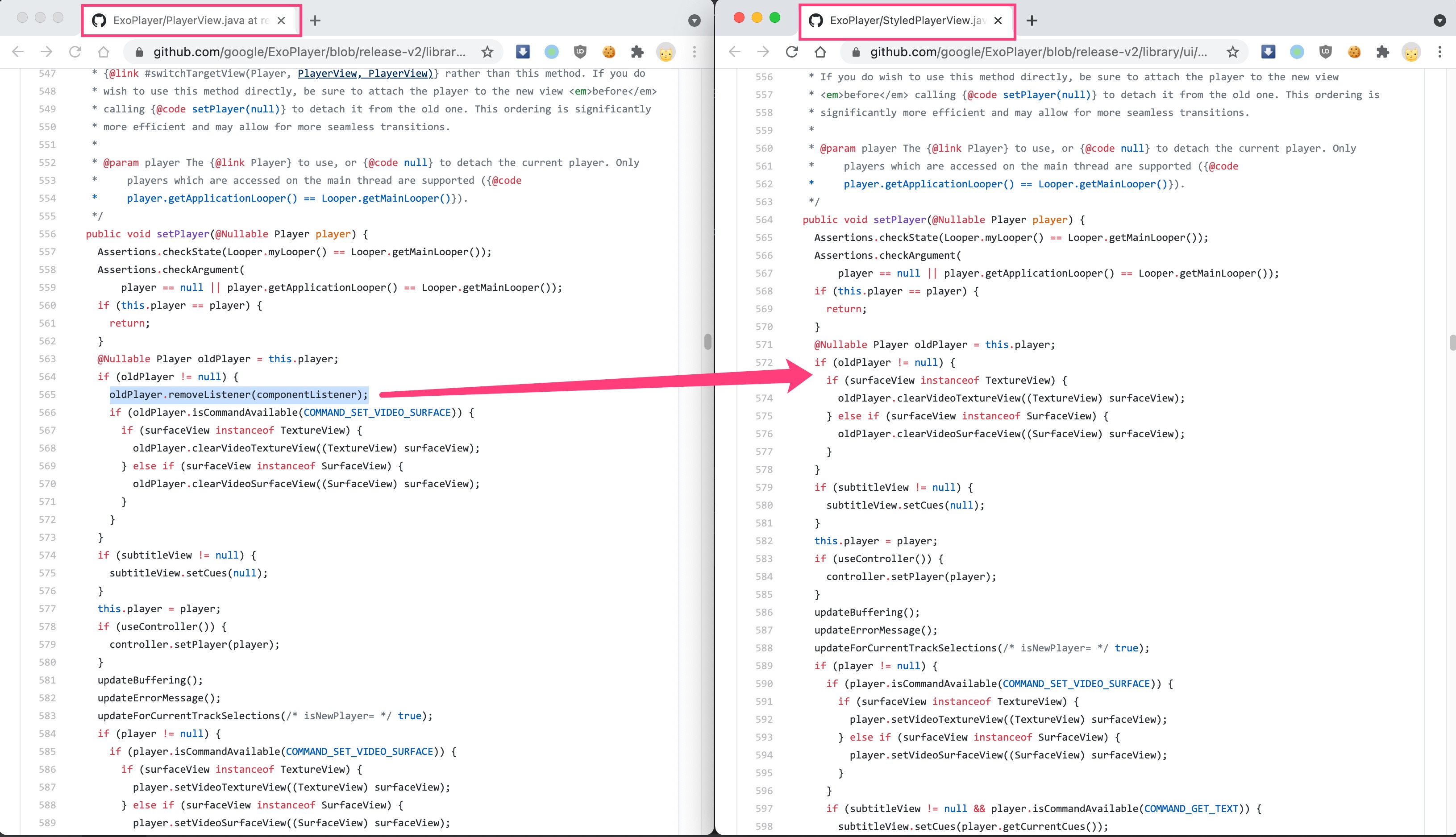 There is oldPlayer.removeListener(componentListener); in PlayerView, I believe it was accidently deleted in StyledPlayerView.