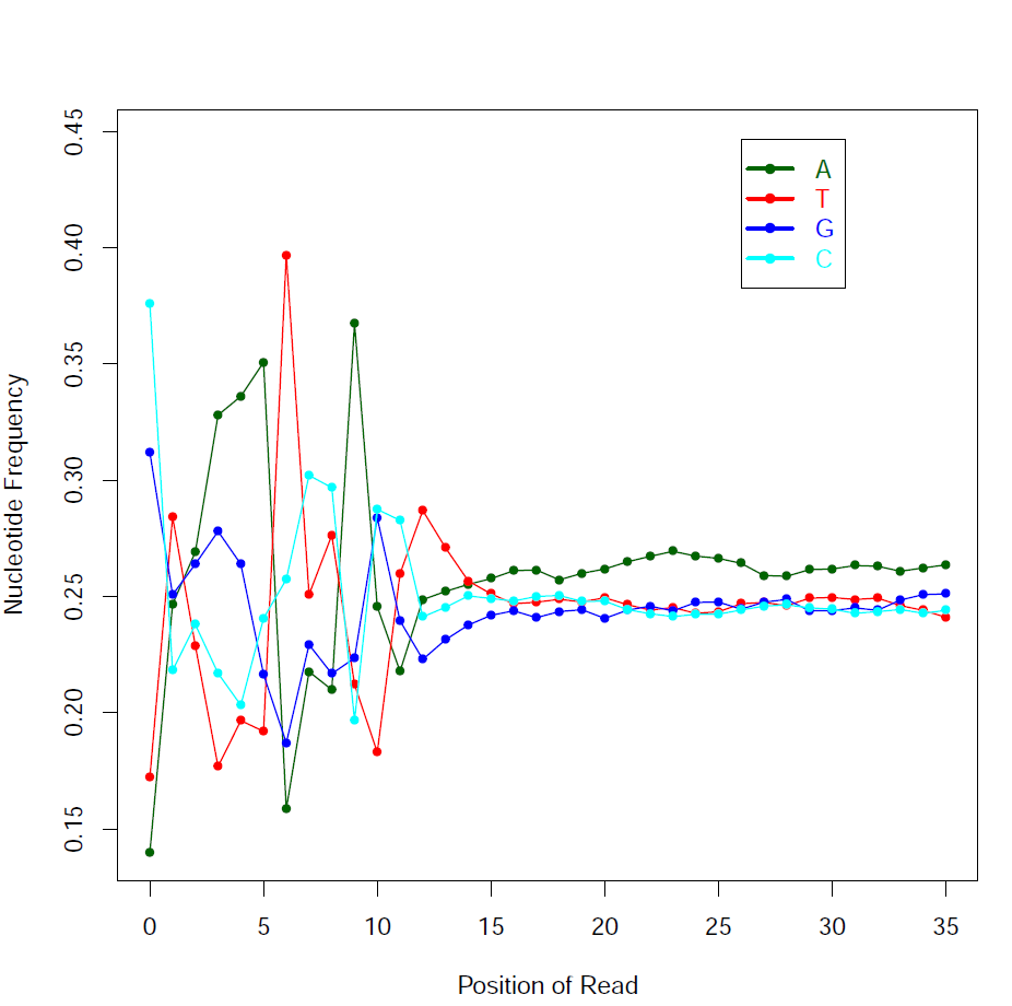 The pattern we see here at the beginning of the reads may be caused by biases caused by random hexamer priming that arose when making cDNA from RNA (http://www.ncbi.nlm.nih.gov/pmc/articles/PMC2896536/ for further discussion).
