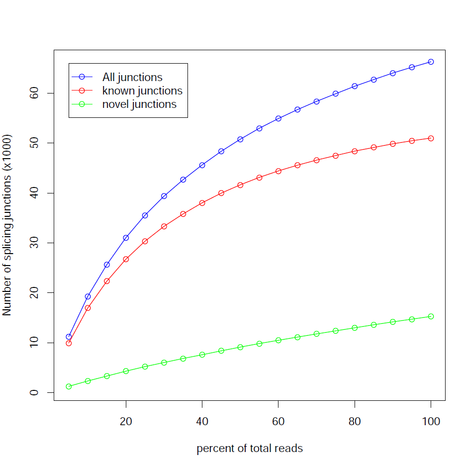 This module checks for saturation of junction discovery by resampling 5%, 10%, 15%, ..., 95% of total alignments from the BAM or SAM file. The number of junctions discovered at each level of downsampling is plotted. If we are exhausting the junction information in our library, the line will plateau as the amount of data increases.