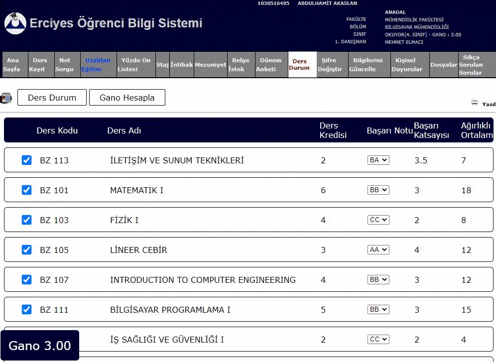 You need to go "Ders Durum" page in obisis.erciyes.edu.tr after that you will see "Gano Hesapla" and "Ders Durum" buttons. These button for making transition between two sections so you will be still have "Ders Durum" page. If you have something wrong with your "gano" then de-select wrong lesson.