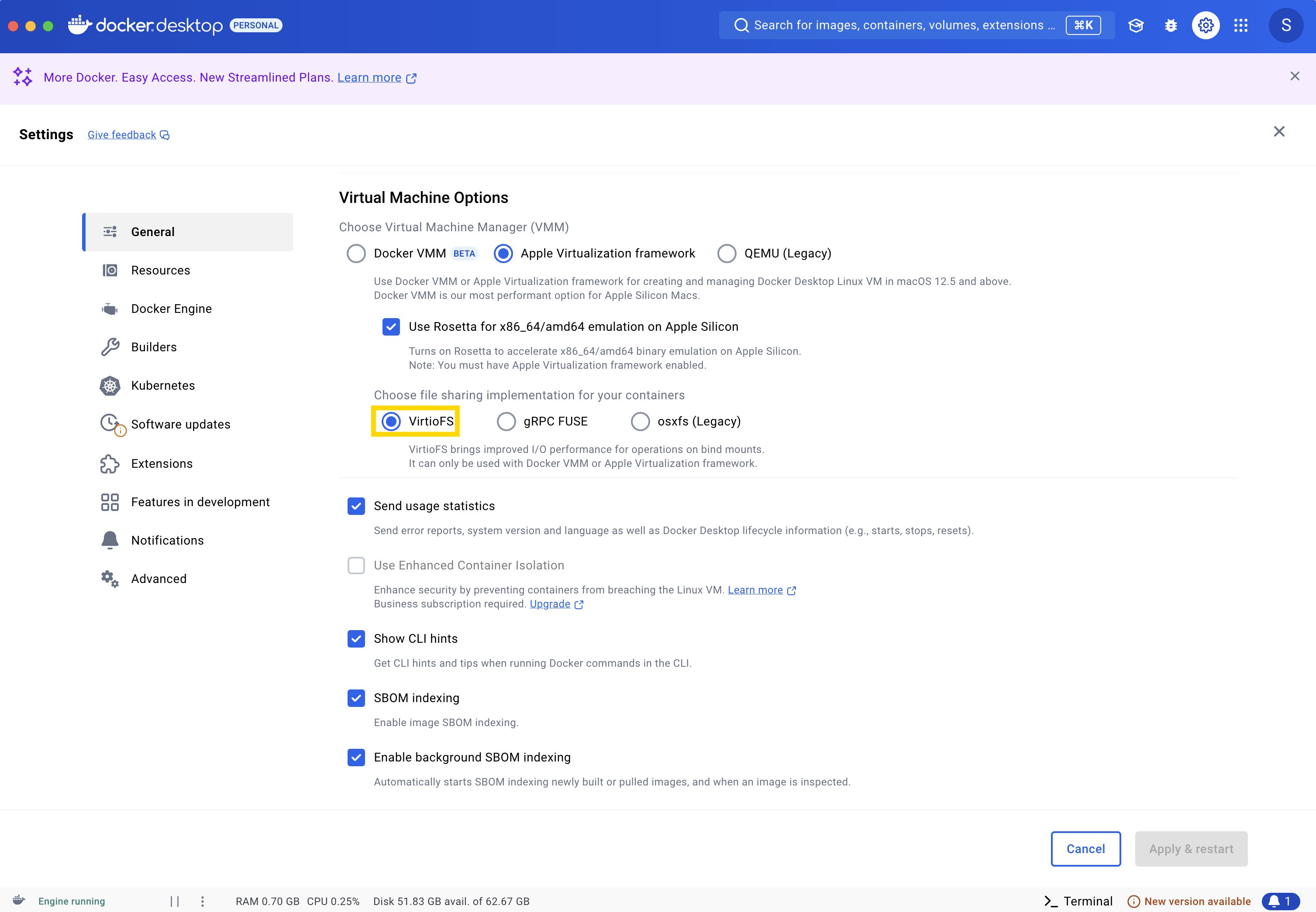- Ensure the VirtioFS file sharing implementation is enabled in the docker settings