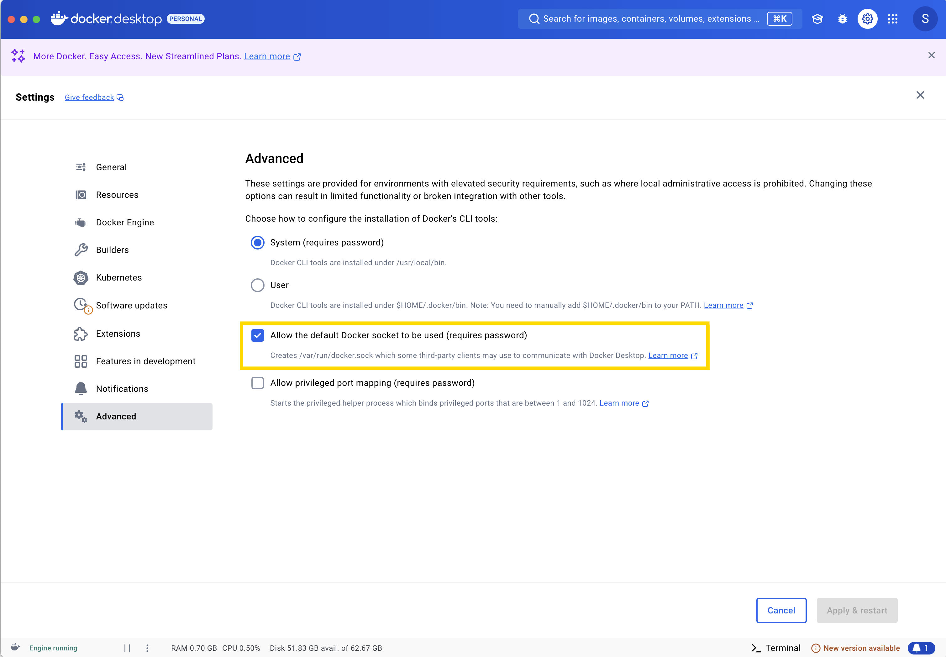 - Ensure the Allow the default Docker sockets to be used (requires password) is enabled in Docker Settings -> Advanced.