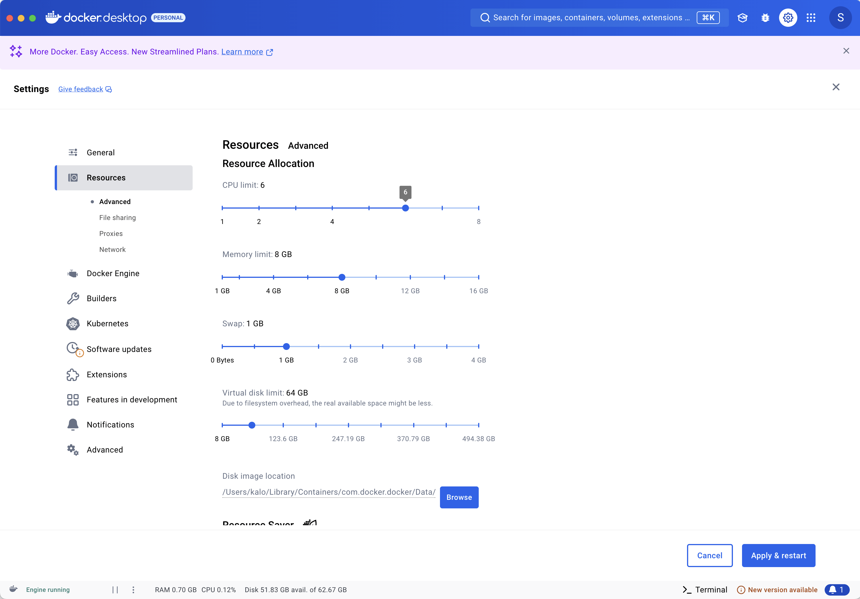- Ensure the following configurations are set at minimum in Docker Settings -> Resources and are available for use.