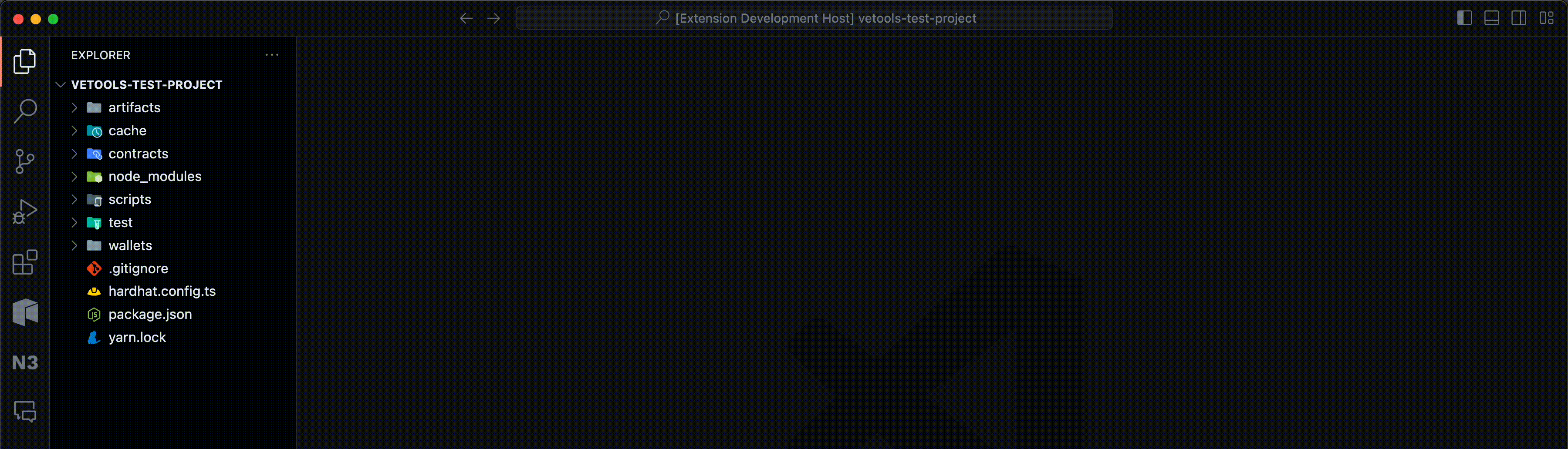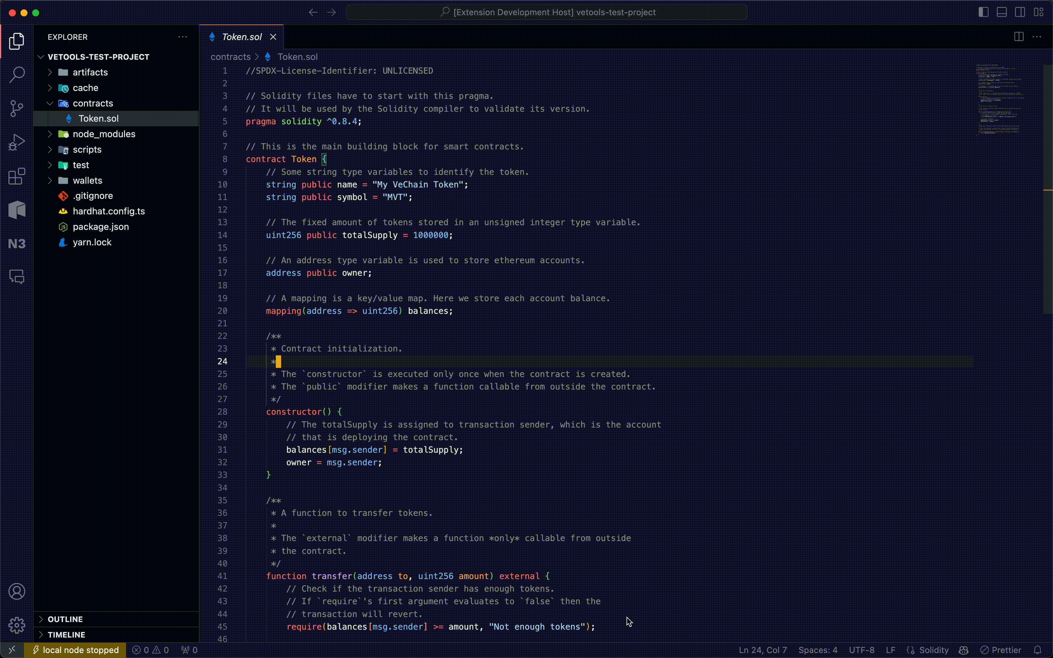 VeTools: Start Local Node(you can also click the orangelocal node stoppedtab on the bottom-left of your VSCode window) - A local blockchain node is spun up!
