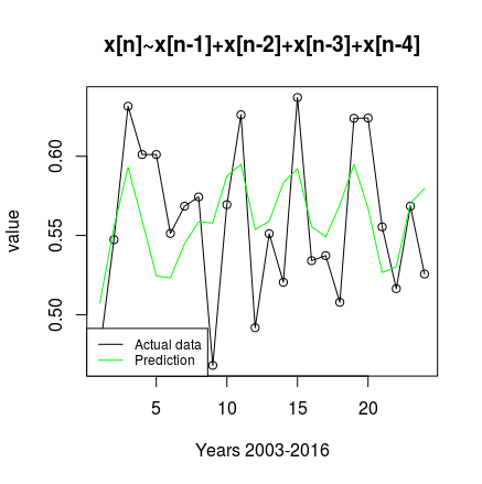 The Yellow_hue_predict.R does some reverse-engineering of the second article. The colors were clustered to the 4-bit palette, the code for Yellow (8) is present from the year 2007 (exactly as in the source article, where the palettes were taken beginning from 2007). After that, mean Hue for all the colors in the Yellow group was calculated and glm model (x[n] ~ x[n-1]+x[n-2]+x[n-3]) applied (if they found a precise relationship with ANN, then simple models should detect something as well). The result shows that indeed some link exists within Yellow cluster: