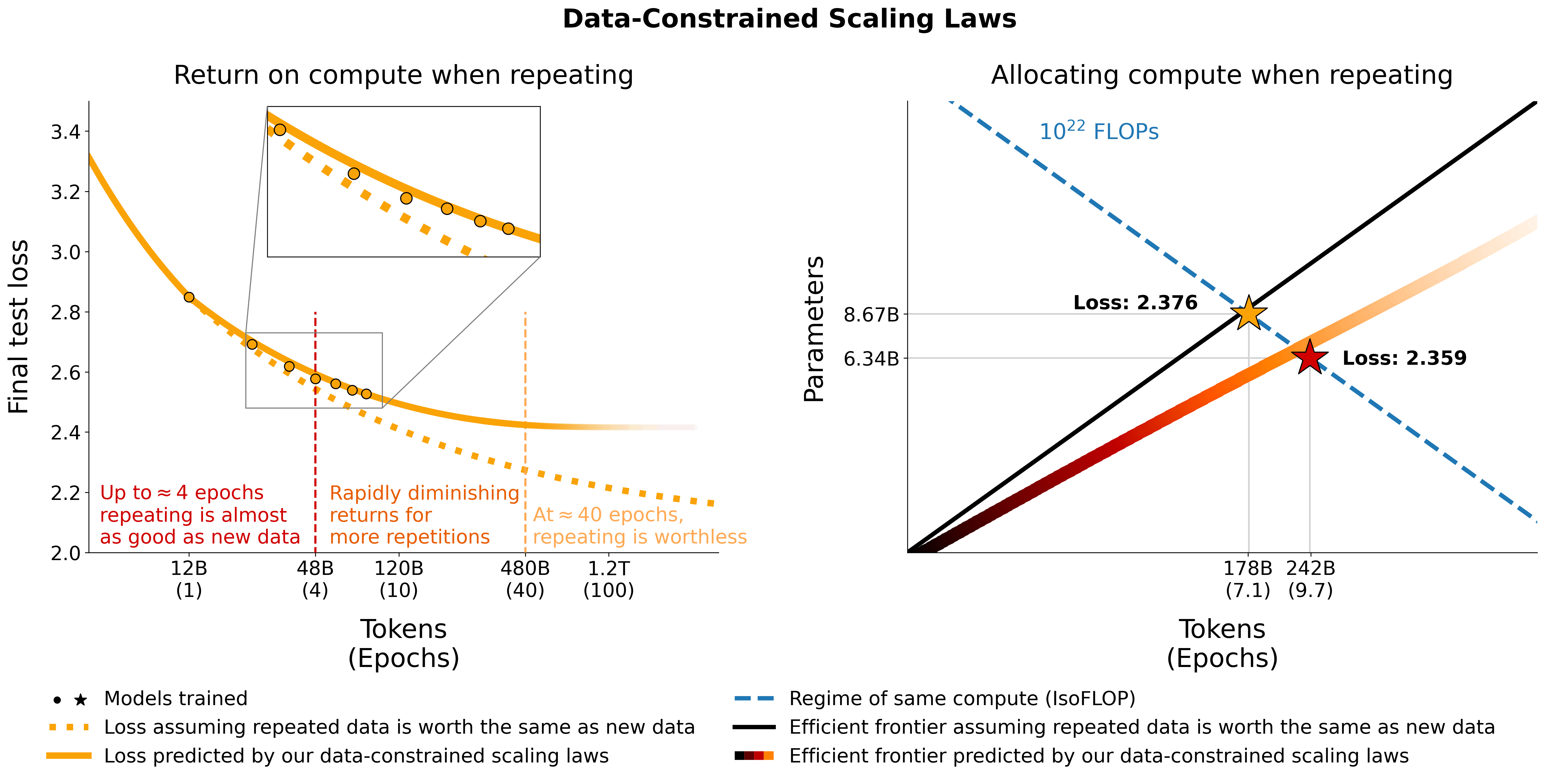 We investigate scaling language models in data-constrained regimes. We run a large set of experiments varying the extent of data repetition and compute budget, ranging up to 900 billion training tokens and 9 billion parameter models. Based on our runs we propose and empirically validate a scaling law for compute optimality that accounts for the decreasing value of repeated tokens and excess parameters. We also experiment with approaches mitigating data scarcity, including augmenting the training dataset with code data, perplexity-filtering and deduplication. Models and datasets from our 400 training runs are available via this repository.