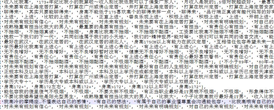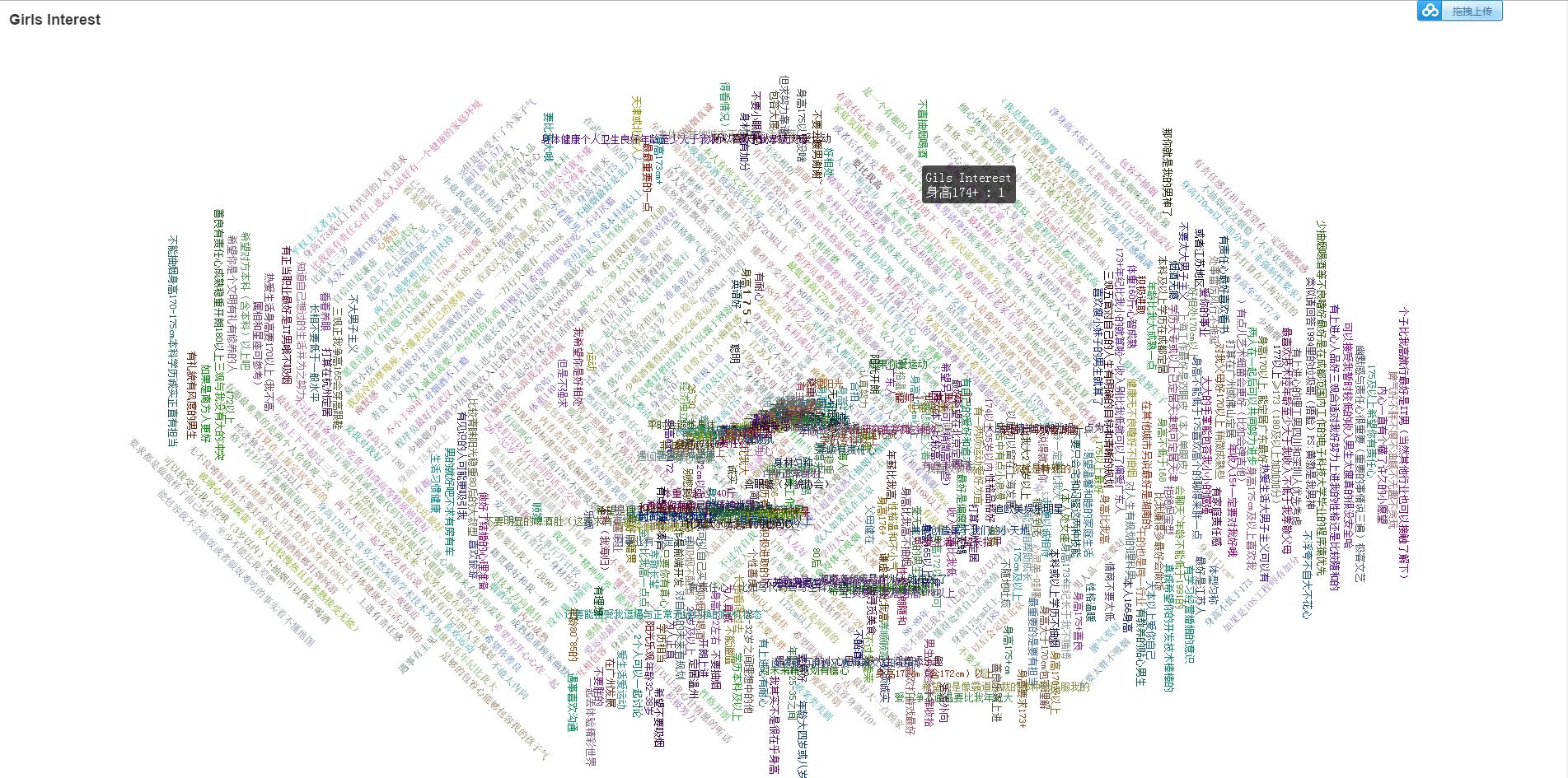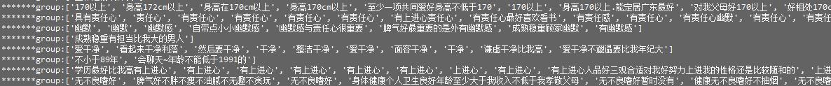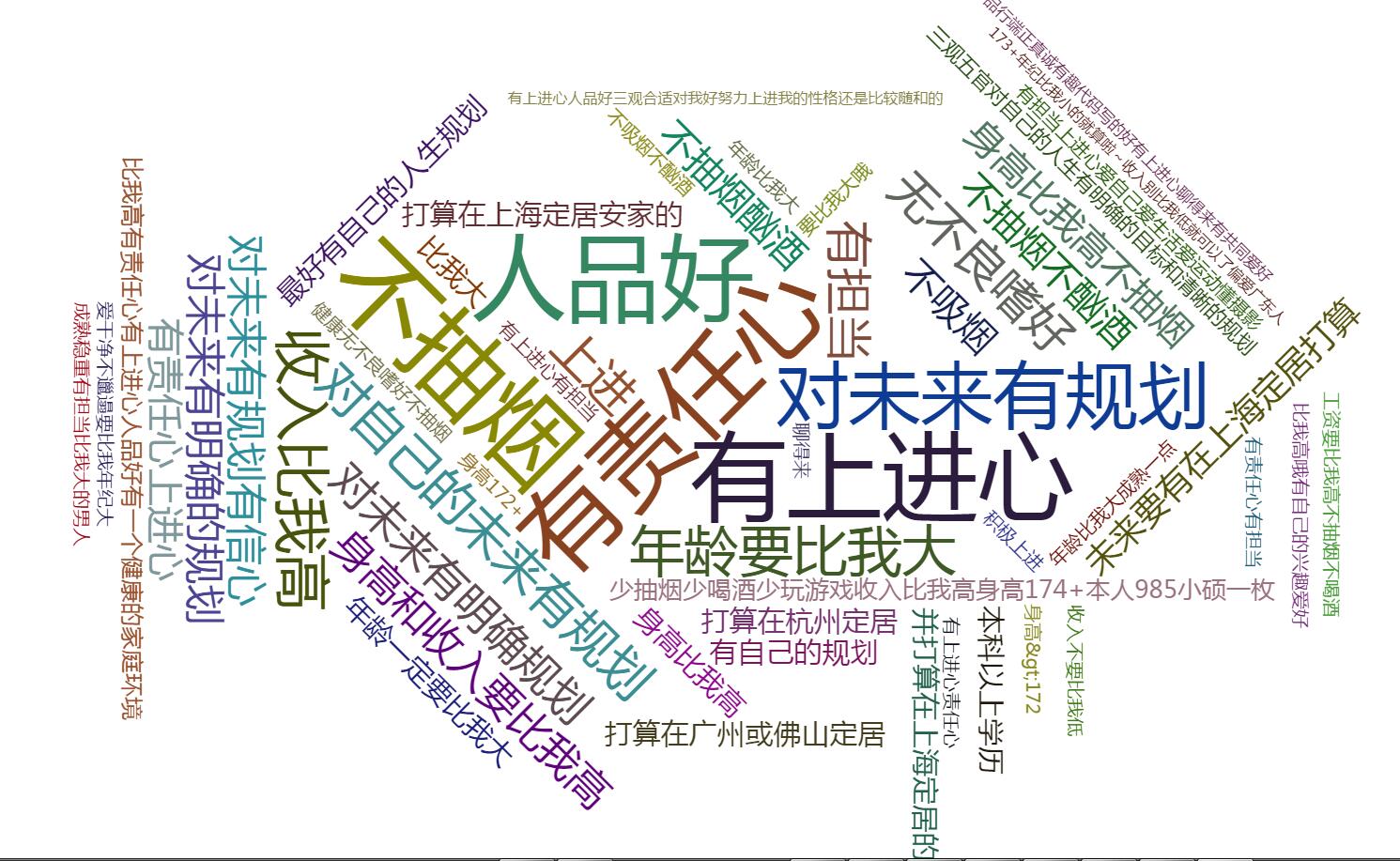 Girls Interest 爬取伯乐在线面向对象的列表信息http://date.jobbole.com/ 爬取女孩的详细信息保存csv 分析计算女孩要求生成字典 利用flas+echart生成字符云 4.0.0.1使用apriori算法进行分类 分类后云图效果 3.0.0.1尝试使用机器学习算法Apriori进行语义聚合处理 2.0.0.2原理和简单,就是比较两个字符串假如相同内容达到50以上则表示表达的意思相同;加入同一group; 2.0.0.1词条聚合算法测试 1.0.0.1分词后 分词效果仍然不够理想自己又单独写了一个算法进行需求聚合 1.0.0.1未进行分词