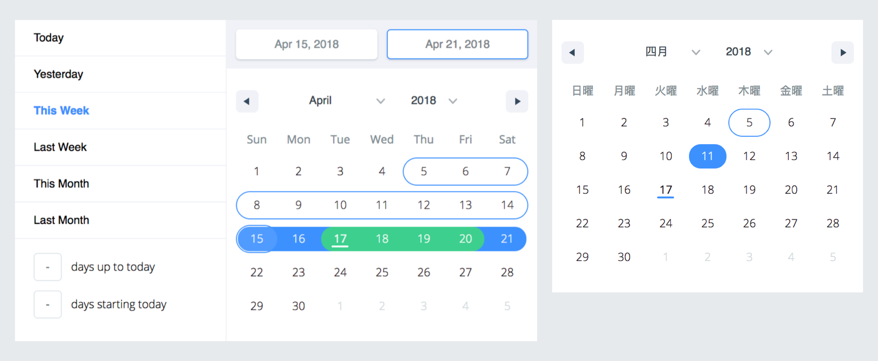 | showDateDisplay(DateRange) | Boolean | true | show/hide selection display row. Uses dateDisplayFormat for formatter |