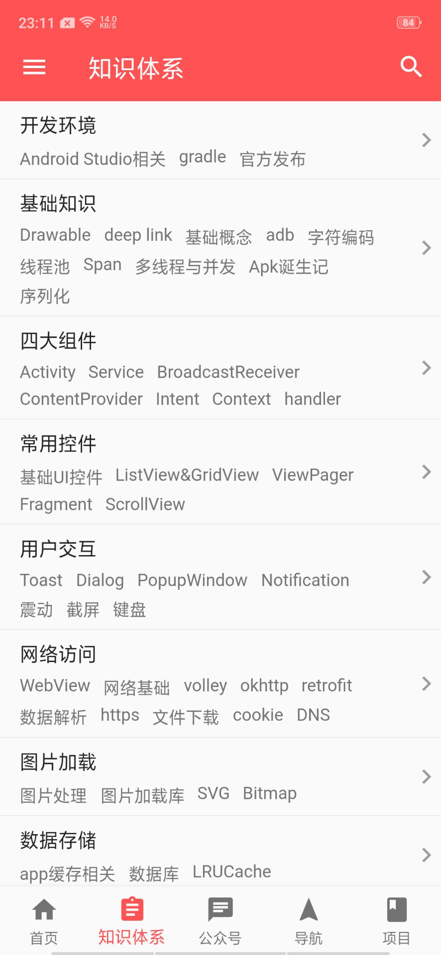 • 首页、知识体系、公众号、导航、项目五大模块;
