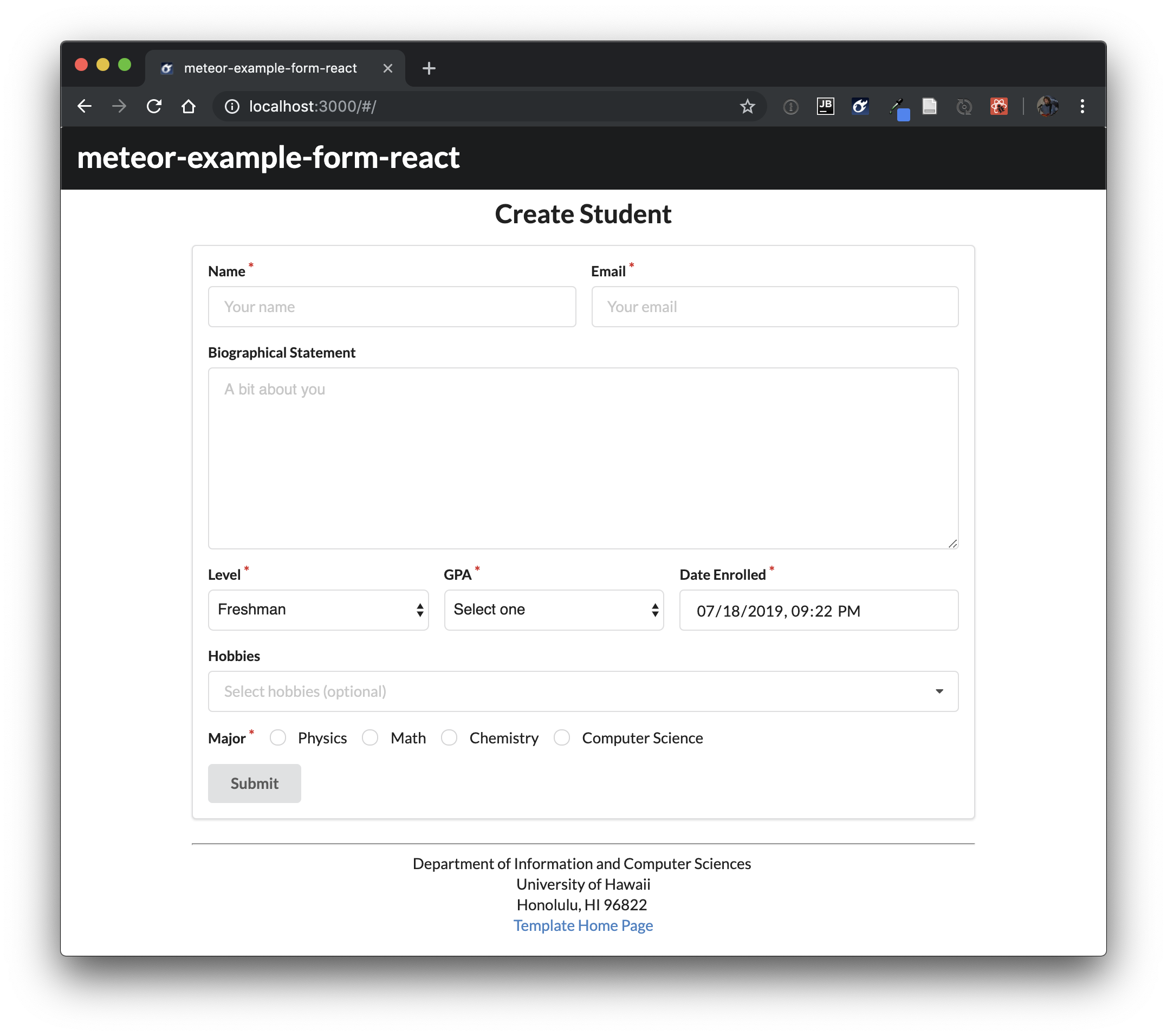 Meteor Application Template React. This sample application illustrates conventions for directory layout, naming conventions, routing, integration of Semantic UI, and coding standards. Meteor-example-form is based on this template, so we won't discuss any of these issues here.