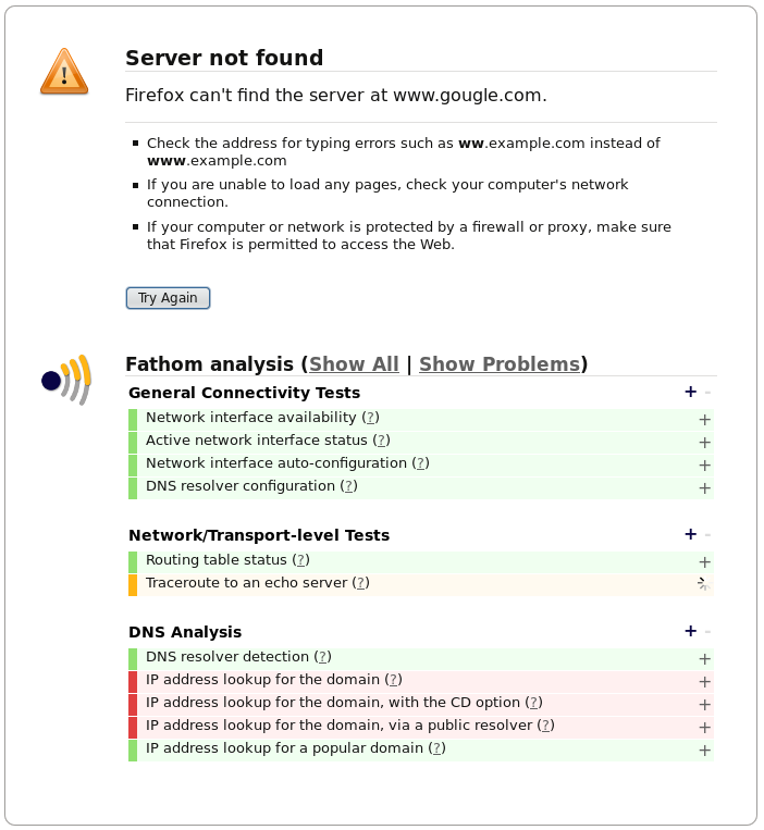 As a proof of concept, Fathom currently includes a connectivity debugger that we built purely using Fathom's APIs. You can run the debugger at any time by clicking "Debug my connection" in Fathom's menu. The analysis also automatically kicks in whenever Firefox flags an error to the user: