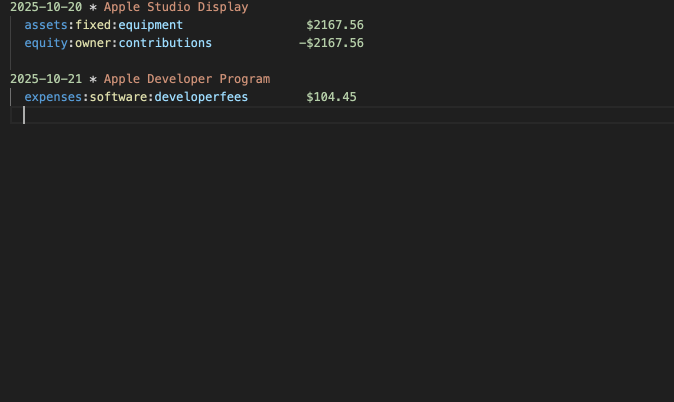 hledger-formatter.formatOnSave: Enable/disable formatting on save (default: false)hledger-formatter.sortOnSave: Enable/disable sorting entries by date on save (default: false)hledger-formatter.amountColumnPosition: Column position for aligning amounts when using fixed column mode (default: 42, range: 20-100)hledger-formatter.amountAlignment: Choose between a fixed column or per-transaction widest alignment (default: widest)hledger-formatter.indentationWidth: Posting indentation width in spaces (default: 4)hledger-formatter.negativeCommodityStyle: Render negatives as-$or$-(default:$-)hledger-formatter.dateFormat: Preferred transaction date layout (YYYY-MM-DD,YYYY/MM/DD,YYYY.MM.DD)hledger-formatter.commentCharacter: Default character used when toggling comments (;,#, or*; default:;)