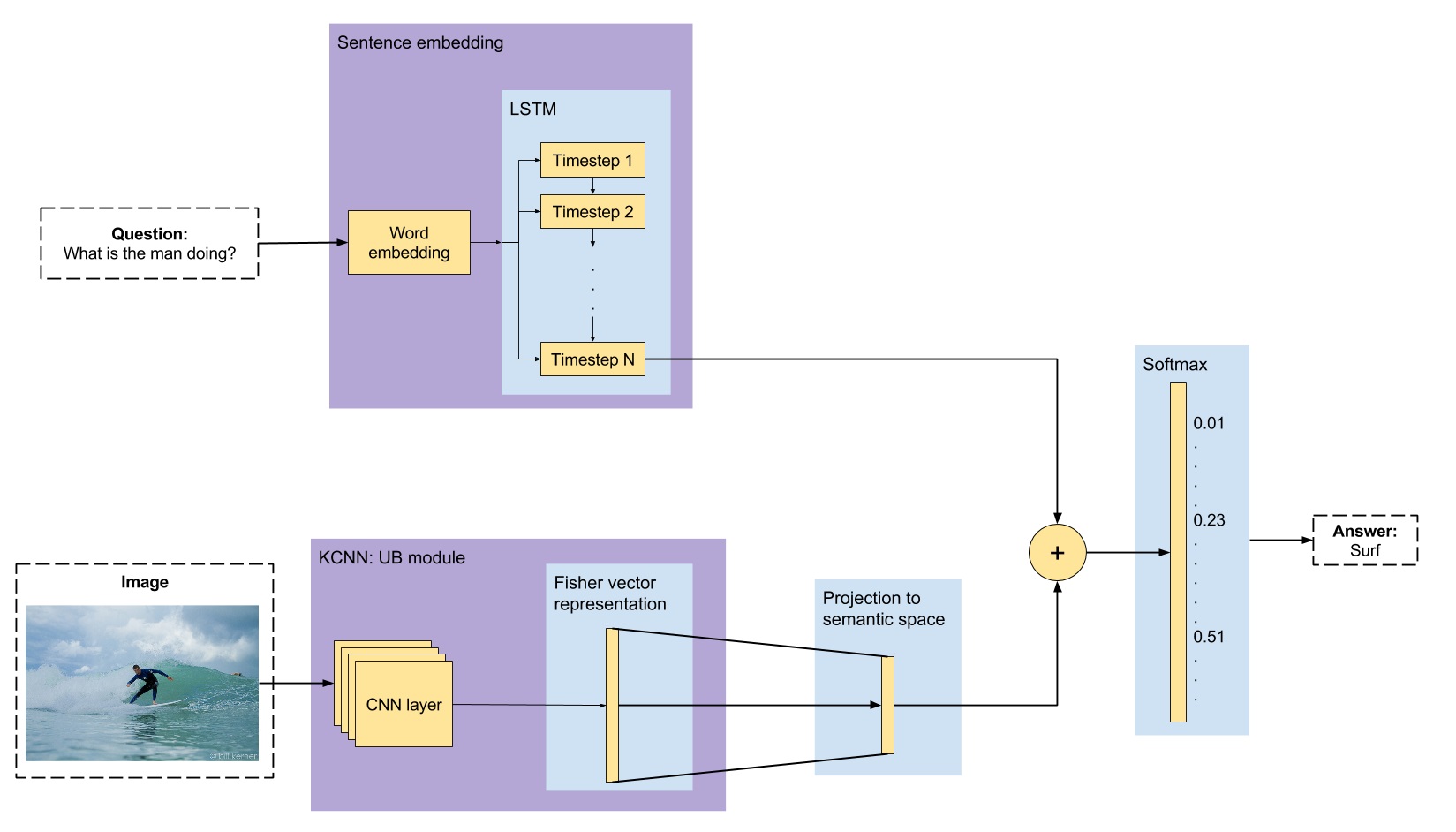 Once we have both the visual and text features, we merge them suming both vectors as they belong to the same space. This final representation is given to another fully-connected layer softmax to predict the answer, which will be a one-hot representation of the word (we are predicting a single word as our answer).