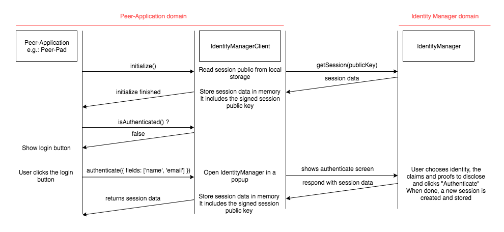 When bootstrapped, the IdentityManagerClient will attempt to read the Session Public Key from the local storage of the applications' origin. The IdentityManagerClient then takes the Session Public Key and queries the IdentityManager to retrieve the session data associated to it. If the IdentityManager responds back with the session data, the user is authenticated and, as such, there's an Authenticated Session. If the IdentityManager doesn't recognize that Session Public Key or if there's no Session Public Key in the first place, there's no Authenticated Session, meaning that no user is authenticated. In such cases, the application may request the Identity Manager to authenticate the user, typically via a login button.