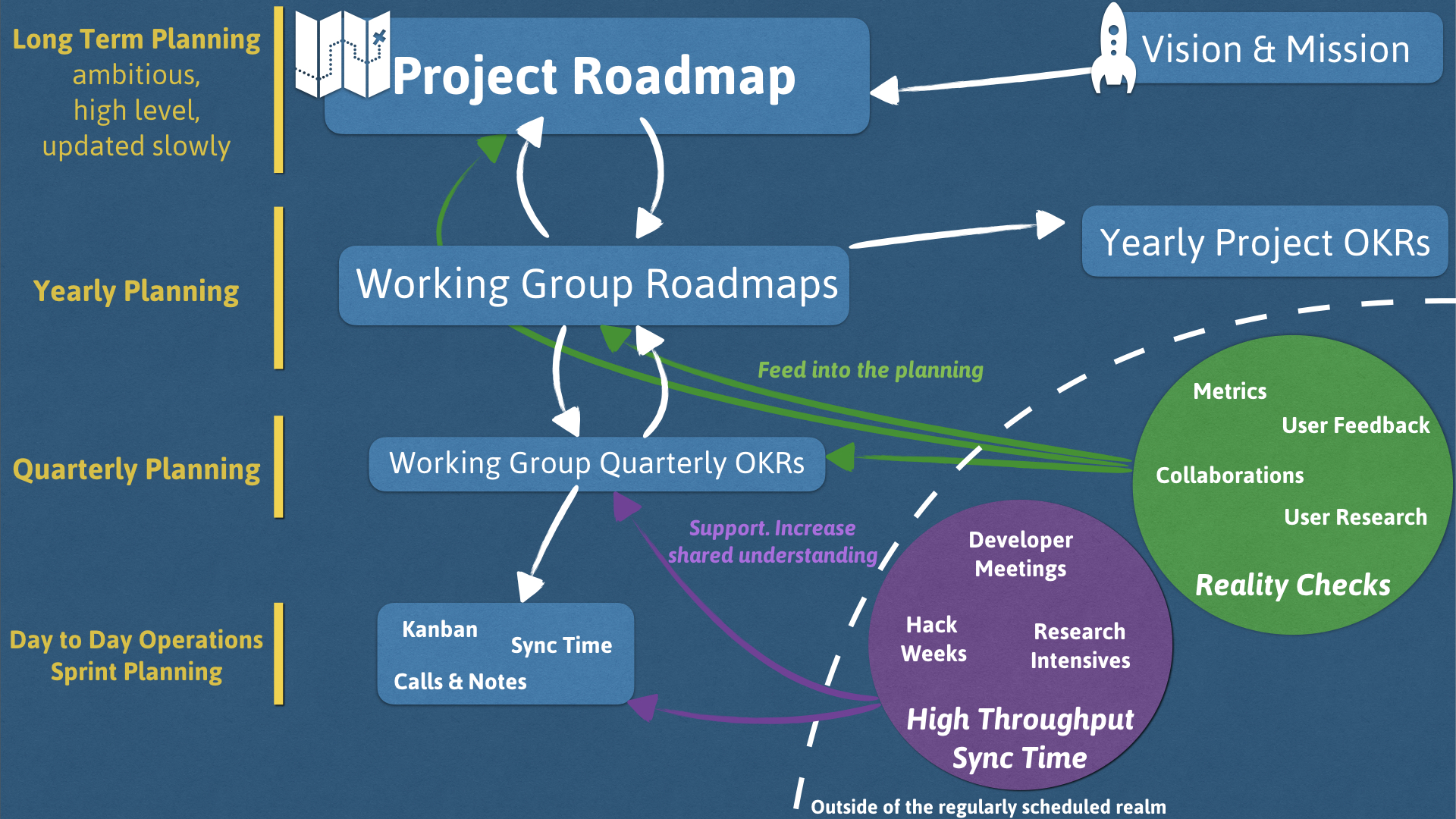 You might hear terms such as "Working Group Roadmap", "Project Roadmap", "OKRs", "Metrics" used often. If you are puzzled about how these all fit together and what is the best resource to look at, we've created the following diagram to illustrate how all of these fit together for the IPFS org.