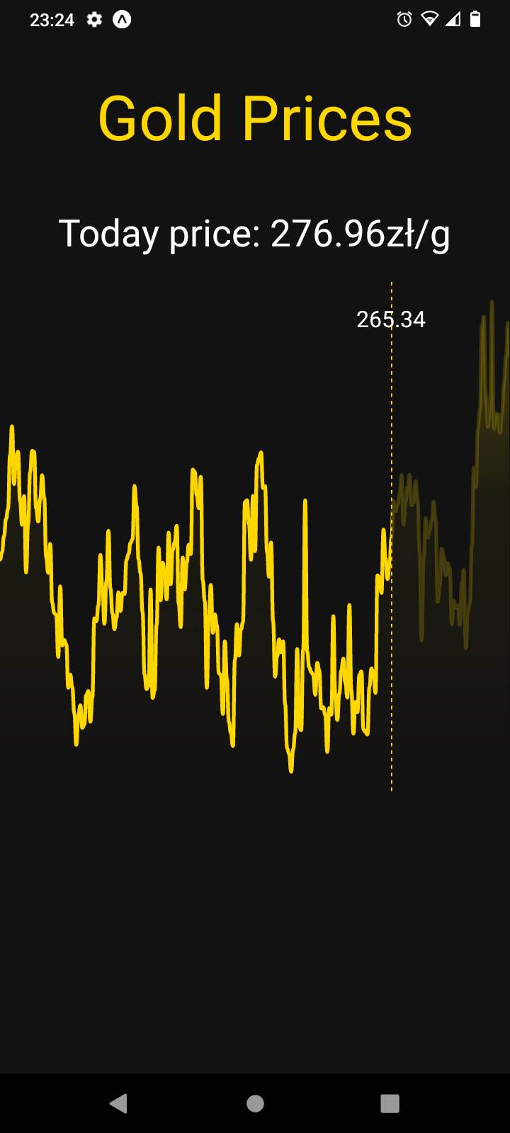 Screenshot of the gold price chart in my app, displaying historical gold values over the past 255 days and today's current price. The current gold price is shown in bold text at the top of the chart. Information about gold prices is fetch from NBP API.