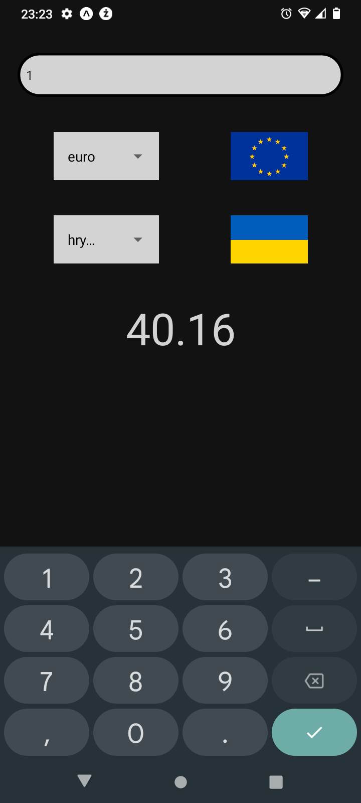 Screenshot of the currency calculator feature in my app, allowing users to quickly convert cash between different currencies. The calculator has two picker fields, one for selecting the initial currency and another for selecting the target currency. The user can then enter the desired amount of cash to convert in the input field below. The app instantly calculates the converted amount and displays it on the screen. This feature is ideal for users who frequently travel abroad or engage in international transactions.