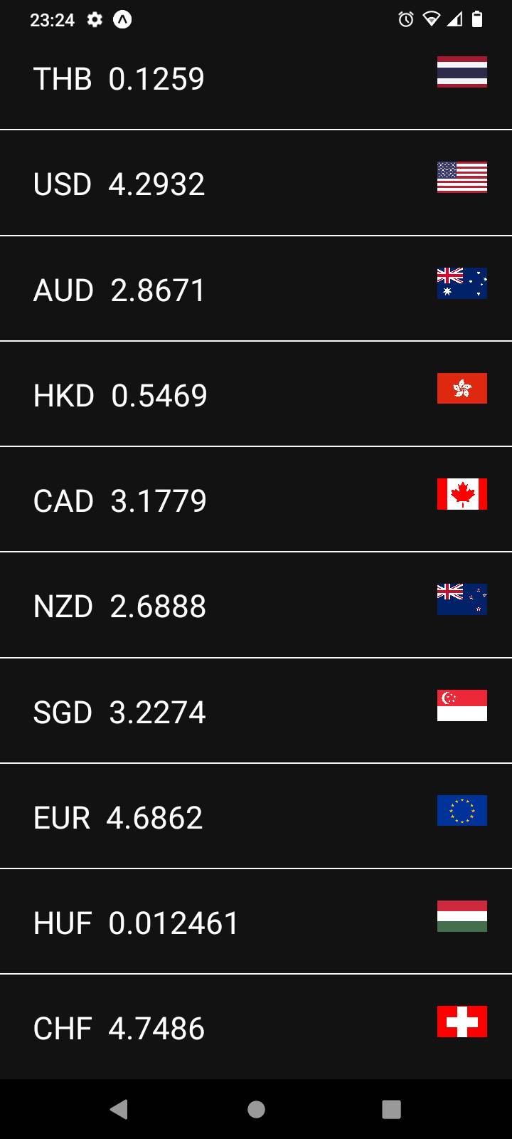 Screenshot of the currency list feature in my app, displaying a flatlist of currencies with their respective codes, prices, and flags of the countries they represent. The data for the prices is fetched in real-time from the NBP API, ensuring that users always have access to the most up-to-date information. Users can tap on any of the currencies in the list to view a detailed description of that currency. This feature is useful for anyone looking to stay up-to-date on the latest currency exchange rates or make international transactions.