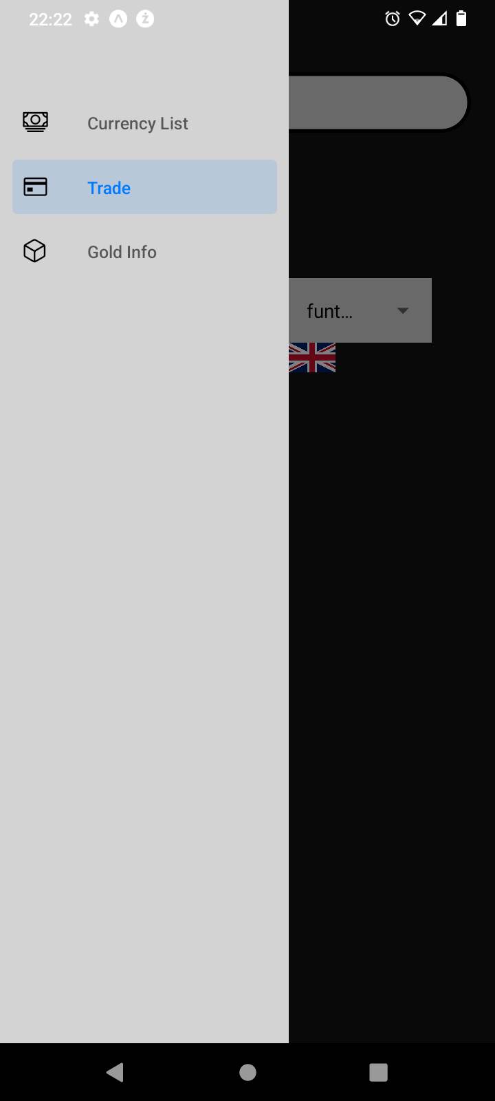 The screenshot shows the drawer navigation feature in my app, which provides easy access to three different pages: the currency list, the currency calculator, and the gold view. The drawer navigation menu is accessible by swiping right from the left edge of the screen. Each page can be selected by tapping its corresponding icon in the drawer navigation menu, making it easy for users to switch between different features and functionalities in the app. Drawer