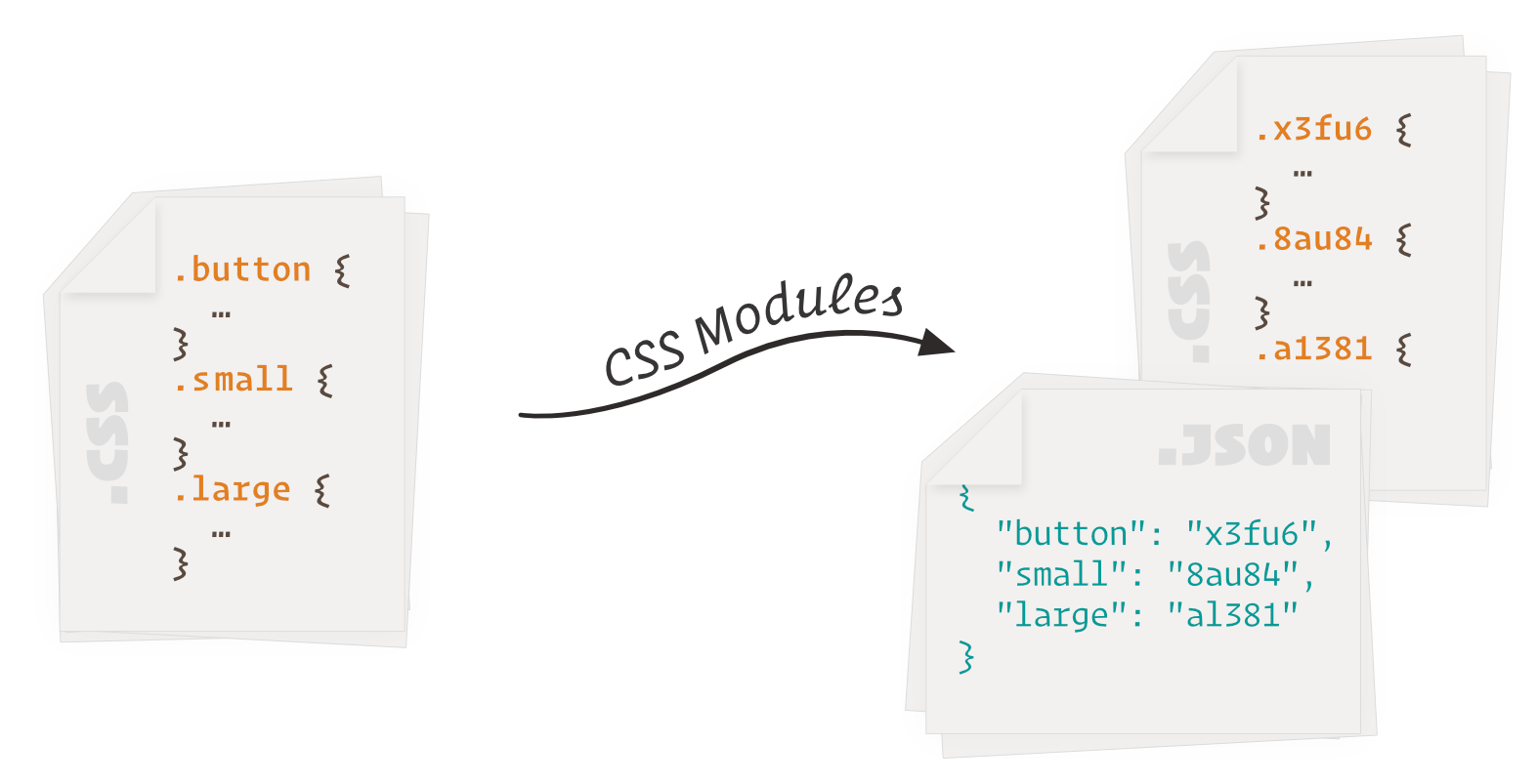 For most people, they’re using CSS Modules with webpack, so what actually happens is abstracted for them. CSS Modules at its core takes a bunch of CSS files and mangles each class name in every file to make every file have its own unique namespace. This is why class names do not conflict. It also exports a JSON file with the mapping of the original class name to the mangled class name. Simply put,