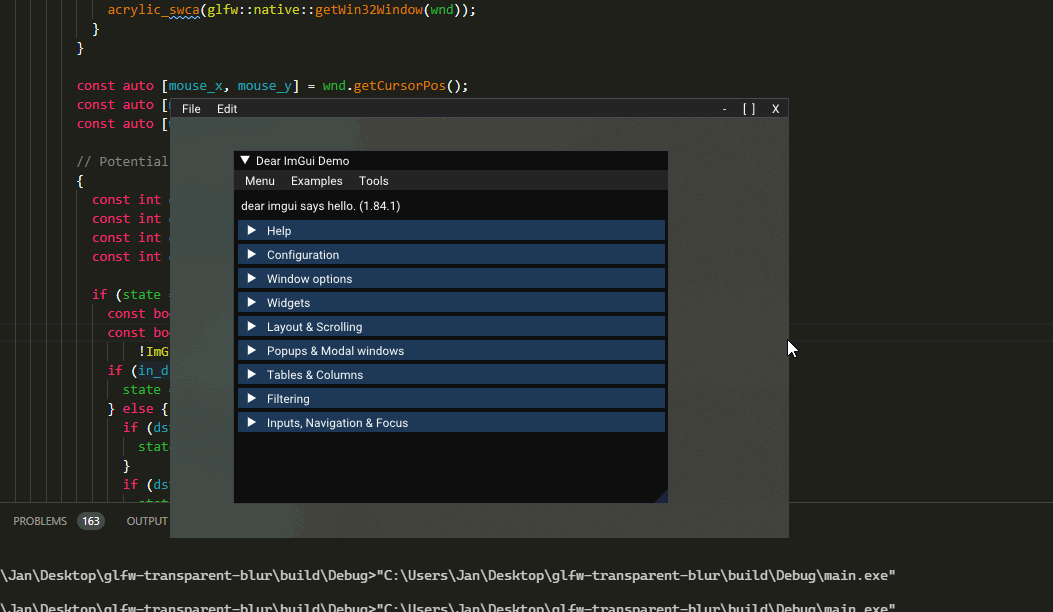 The goal here is to create a window that will have the characteristic frosted glass look. Currently it has a basic implementation on Windows using the undocumented function SetWindowCompositionAttribute which enables Acrylic effects for the window.