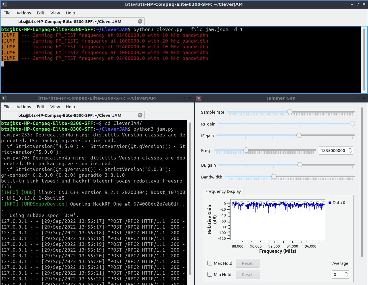 $ gnuradio-companion sources/jam.grcThen you can configure the central frequency with the QT GUI to target a frequency. But this tool has also a feature to do it automatically.
