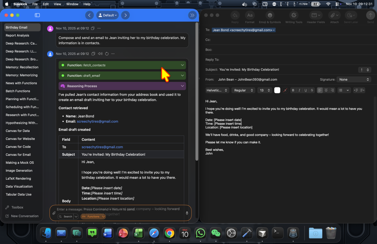 When telling Sidekick to draft an invitation email for a birthday celebration to my friend Jean, Sidekick finds my birthday and Jean's email address from my contacts book, and creates a draft in my default email client.