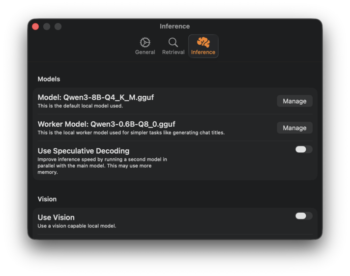 Sidekick uses llama.cpp as its inference backend, which is optimized to deliver lightning fast generation speeds on Apple Silicon. It also supports speculative decoding, which can further improve the generation speed.