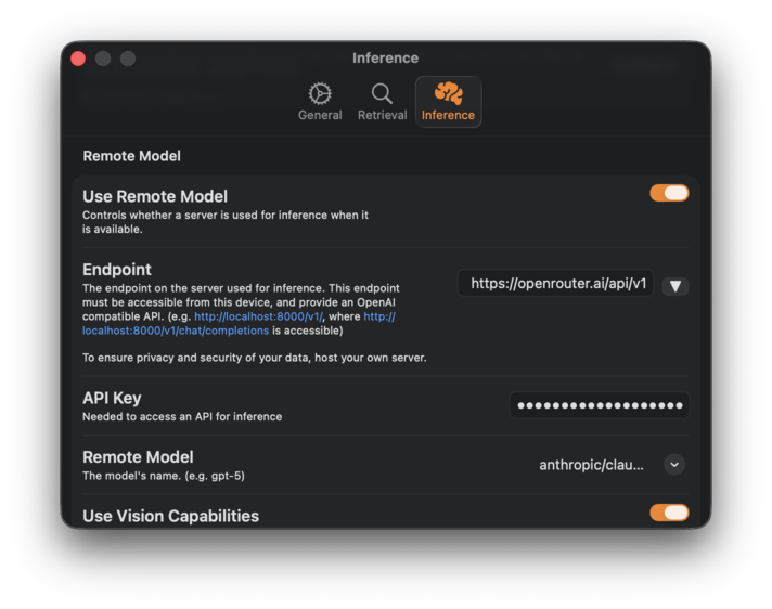 In addition to its core local-first capabilities, Sidekick allows you to bring your own key for OpenAI compatible APIs. This allows you to tap into additional remote models while still preserving a primarily local-first workflow.