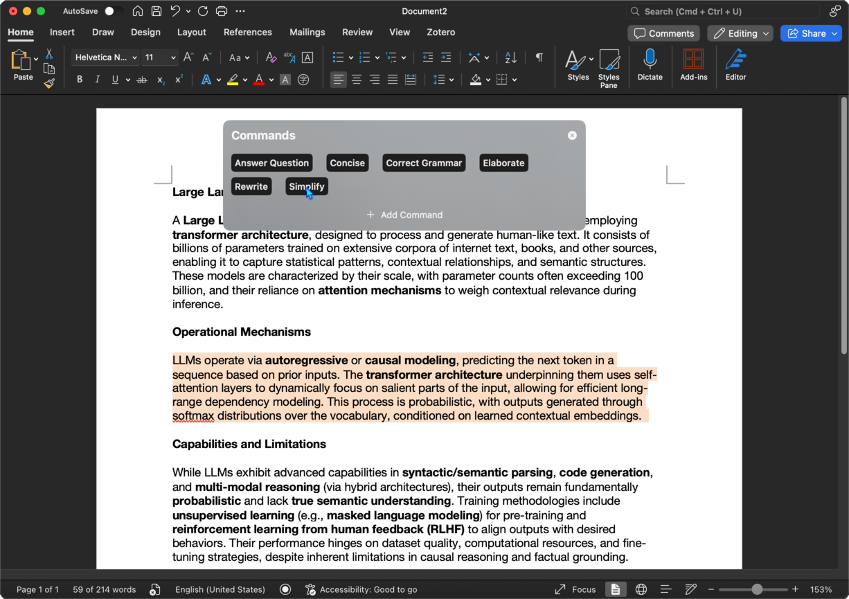 Press Command + Control + I to access Sidekick's inline writing assistant. For example, use the Answer Question command to do your homework without leaving Microsoft Word!