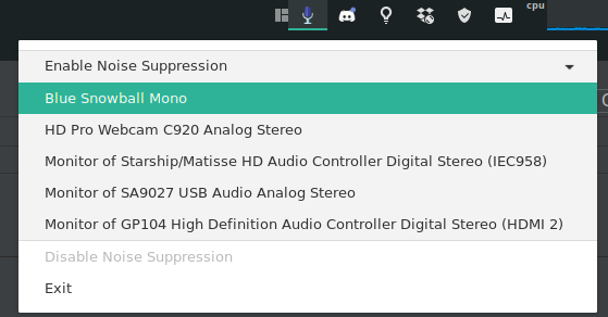 When you run Cadmus, you'll see a new notification icon showing a microphone in your chosen shell. On click, you'll be able to select the microphone whose noise you wish to suppress. Cadmus will then create a new PulseAudio microphone named Cadmus Denoised Output, which will reflect the denoised output of the chosen microphone. You should then be able to select this as an input in any application of your choice. Note that if you're currently recording audio, you'll have to stop recording and start again in order for changes to occur - streams which are currently being recorded will not be hot-swapped to the new input.