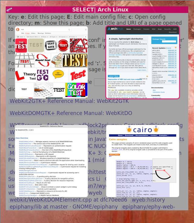 tabbed wyeb plugtoworks though. Make sure tabbed takes no notice of the reordering of wins without addingif(sel != c) focus(c);to the configure event. - Rocker gestures and middle button gestures. We can change it even to call a script. (e.g. mdlbtnleft=spawn sh -c "wyeb // showmsg `pwd`") Of course it is in the 'set;', so we can set it by uri.