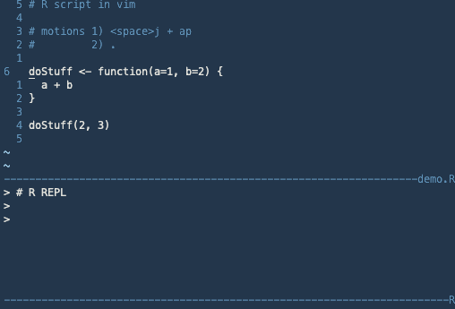 Main use case is sending code to and from the REPL running inside :terminal buffer.