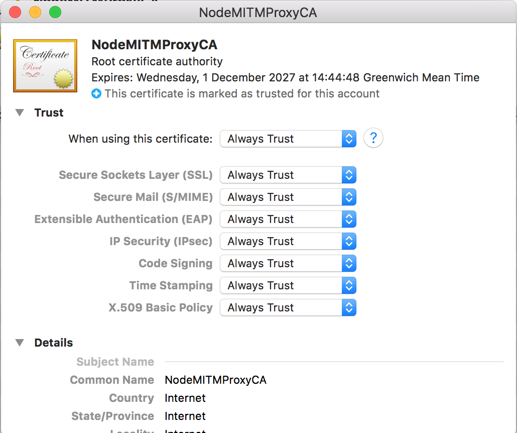 After certificate is installed, expand the Trust section and toggle the first dropdown to Always Trust: