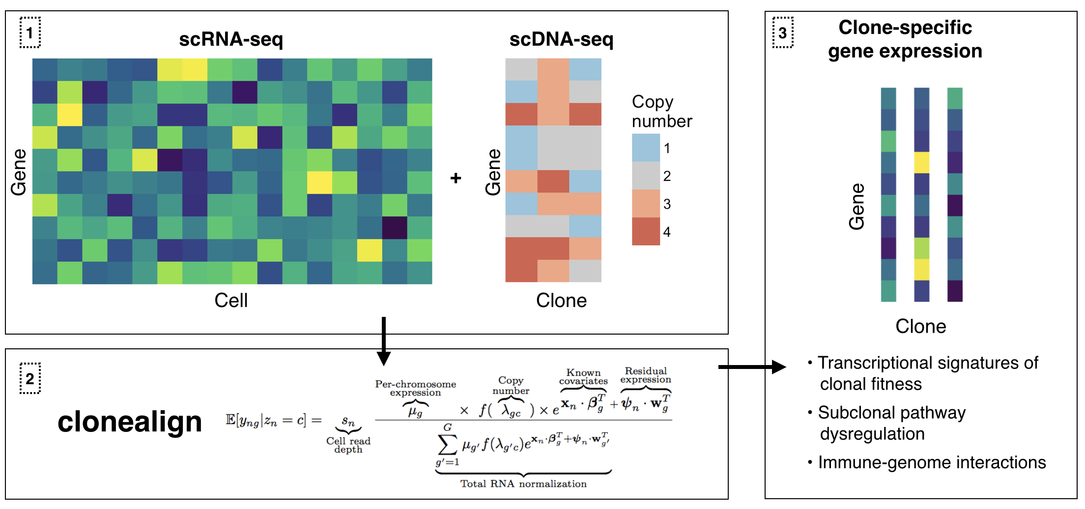 clonealign assigns single-cell RNA-seq expression to cancer clones by probabilistically mapping RNA-seq to clone-specific copy number profiles using reparametrization gradient variational inference. This is particularly useful when clones have been inferred using ultra-shallow single-cell DNA-seq meaning SNV analysis is not possible.