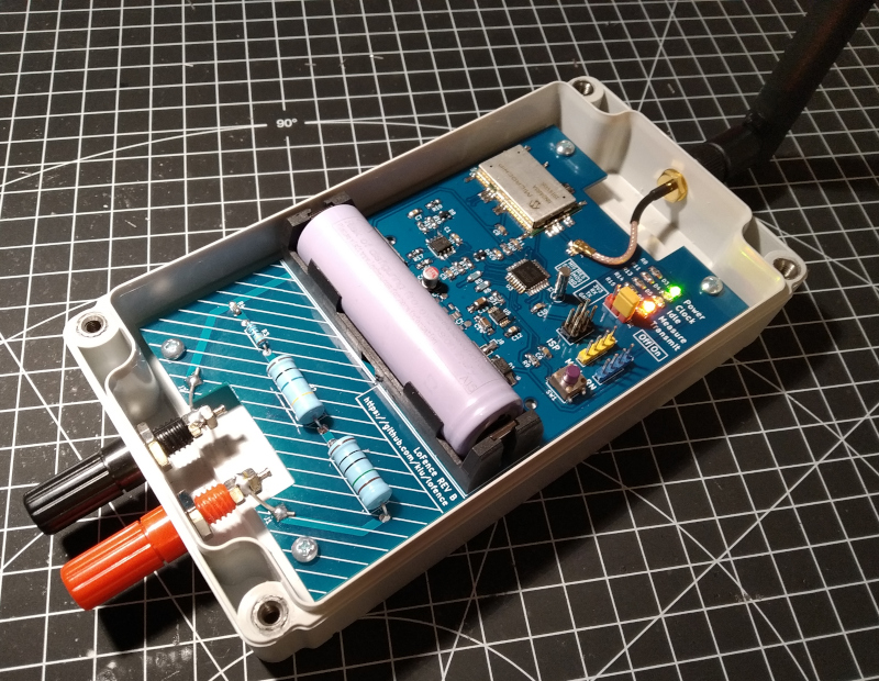 The build is quite unspectacular. Spinning up a board with some AVR, put an antenna and the RN2483 on it, a big resistor divider with an op-amp and some resistors, debug LEDs and pin headers, an 18650 battery and a waterproof case. Et voila.